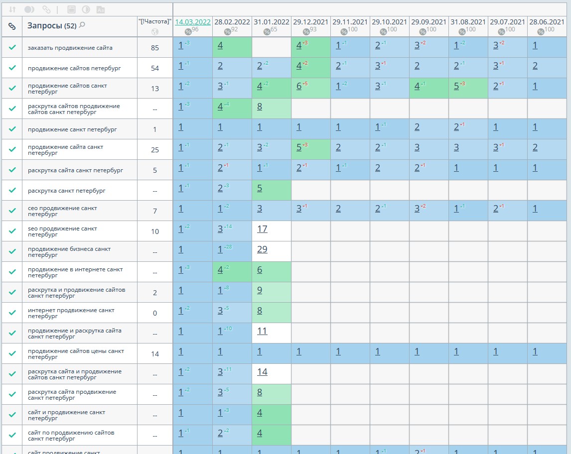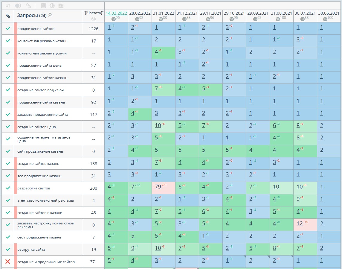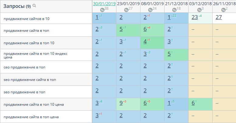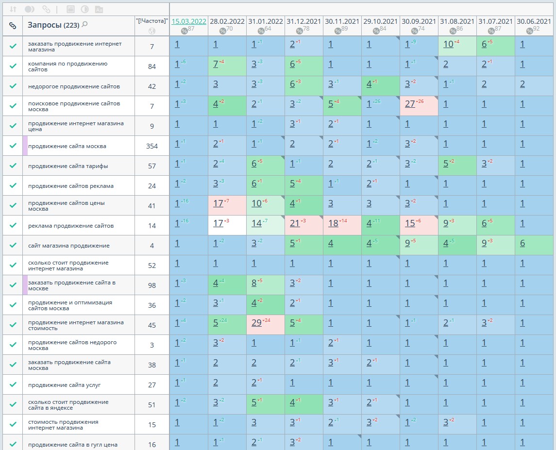 Таблица с позициями сайта с начала работ по SEO продвижению