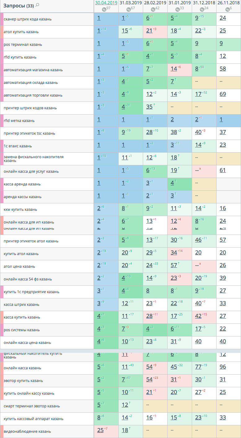 Таблица некоторых запросов с позициями сайта с начала работ по SEO продвижению