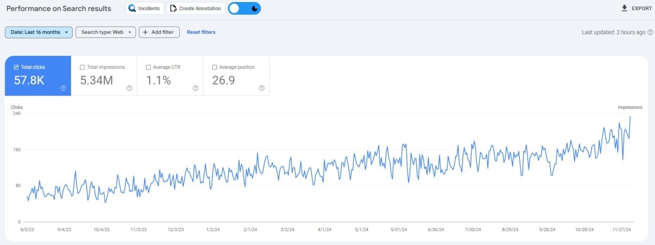 1. Клики и показы по Google Search Console за 16 месяцев: