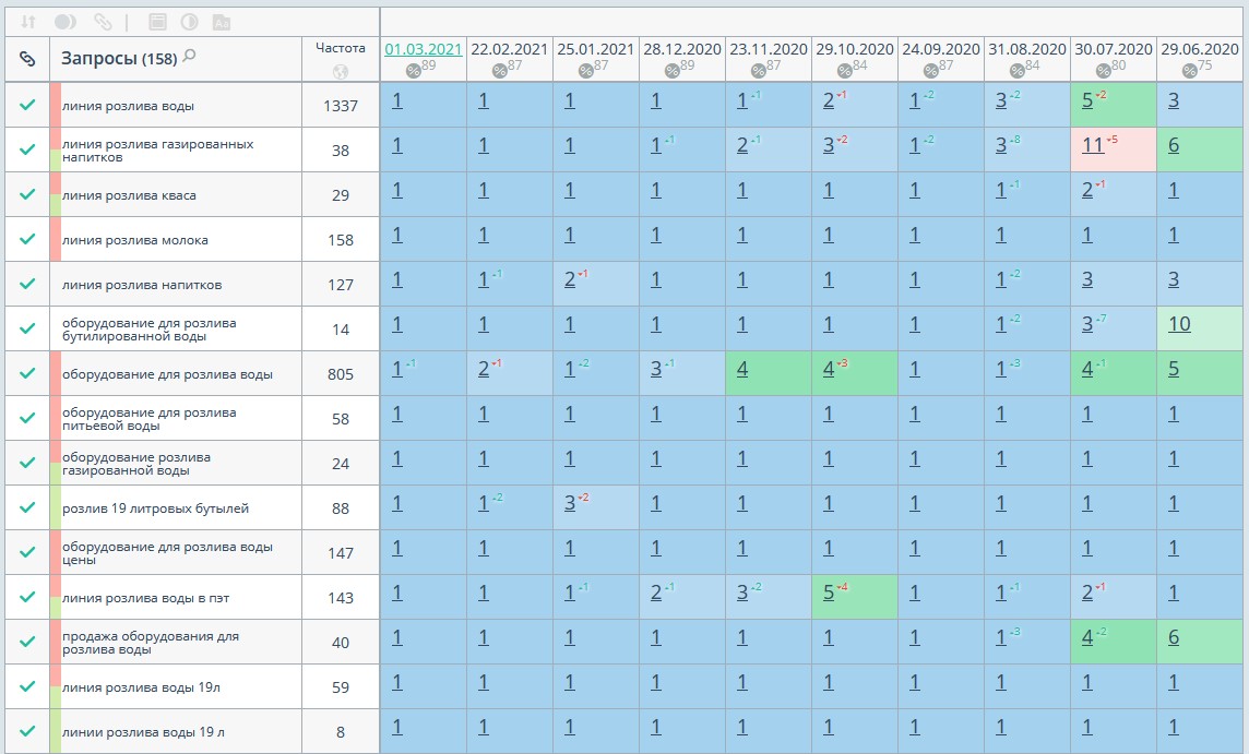 Сбор высокочастотных и среднечастотных запросов по теме продажи оборудования для розлива жидкости, оптимизация страниц сайта под запросы для их выведения в ТОП-10 выдачи поисковых систем: