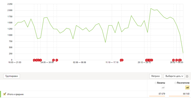1. Количество визитов составило 87 479 за год, среди которых 66 148 уникальных посетителей
