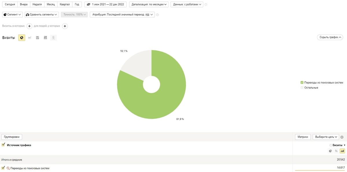 По метрикам: переходы из поисковых систем за 15 месяцев составили 82%, или 16813 переходов. Привлечено более 16 000 потенциальных заказчиков услуг в проект, трафик увеличился в 16 раз.