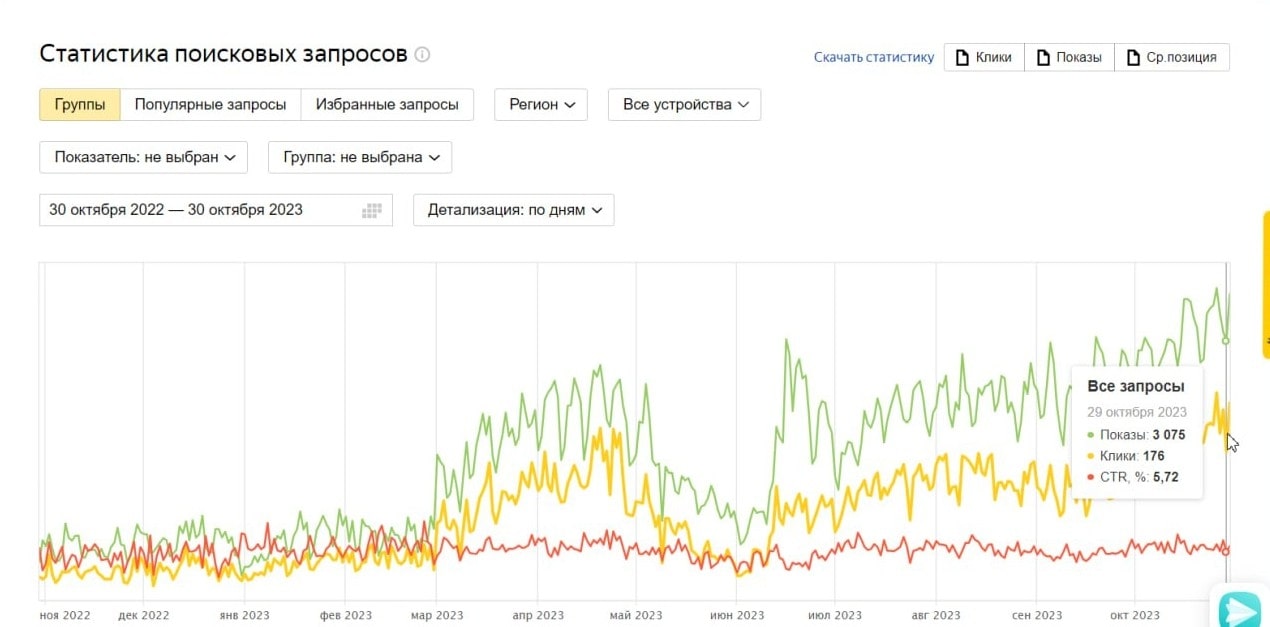 Такая постатейная проработка контента позволила увеличить количество переходов с 30 кликов в сутки до 250 кликов в сутки