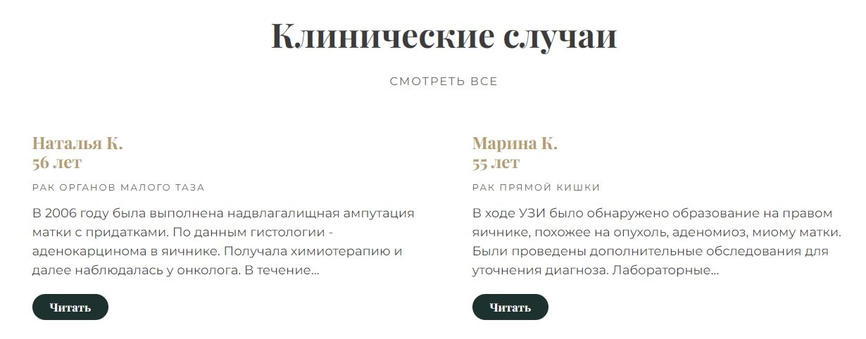 Сайт хирурга-онколога является одновременно и коммерческим, и информационным. Контент, размещаемый на страницах, должен быть в первую очередь экспертным, и только потом продающим. Для этого страницы с контентом разбиты на отдельные блоки: симптоматика и показания, виды лечения, видео с операциями. Отдельно вынесен прайс, ответы на вопросы. Отзывы оформлены как разбор конкретных клинических случаев из врачебной практики.