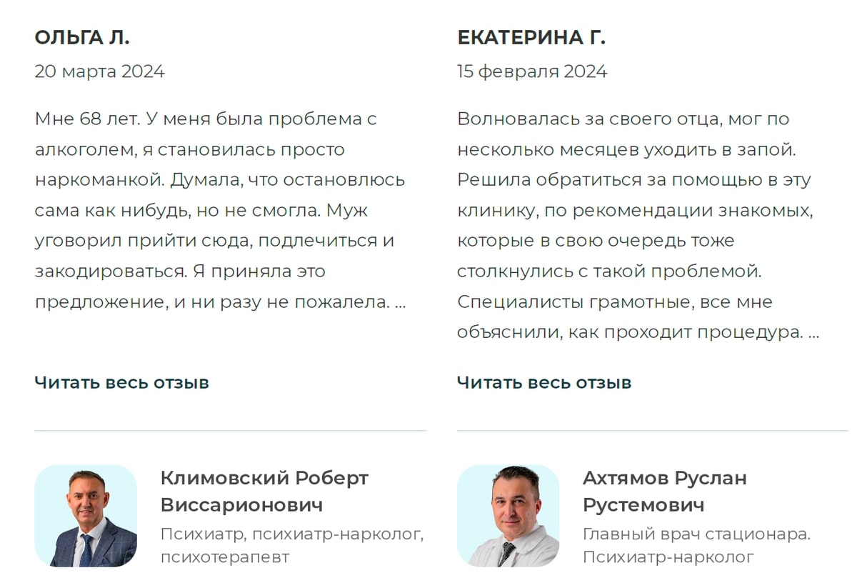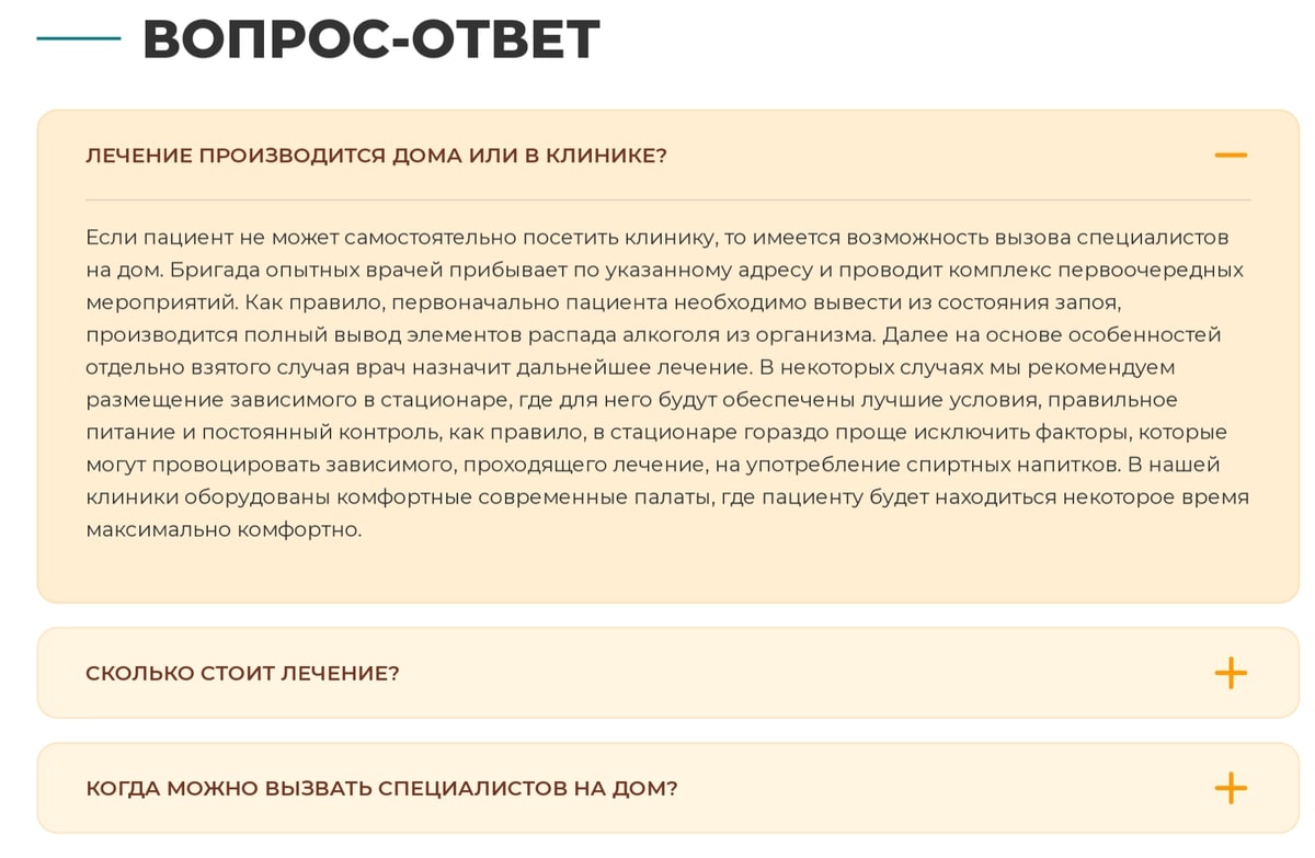 • В отличие от конкурентов, которые используют одинаковые сквозные блоки для страниц услуг клиники, мы оптимизировали под LSI ключи все отзывы и рубрику вопрос-ответ. Теперь все они касались только тематики продвигаемой страницы. Так мы улучшили релевантность и закрепили ключи на их целевых страницах.