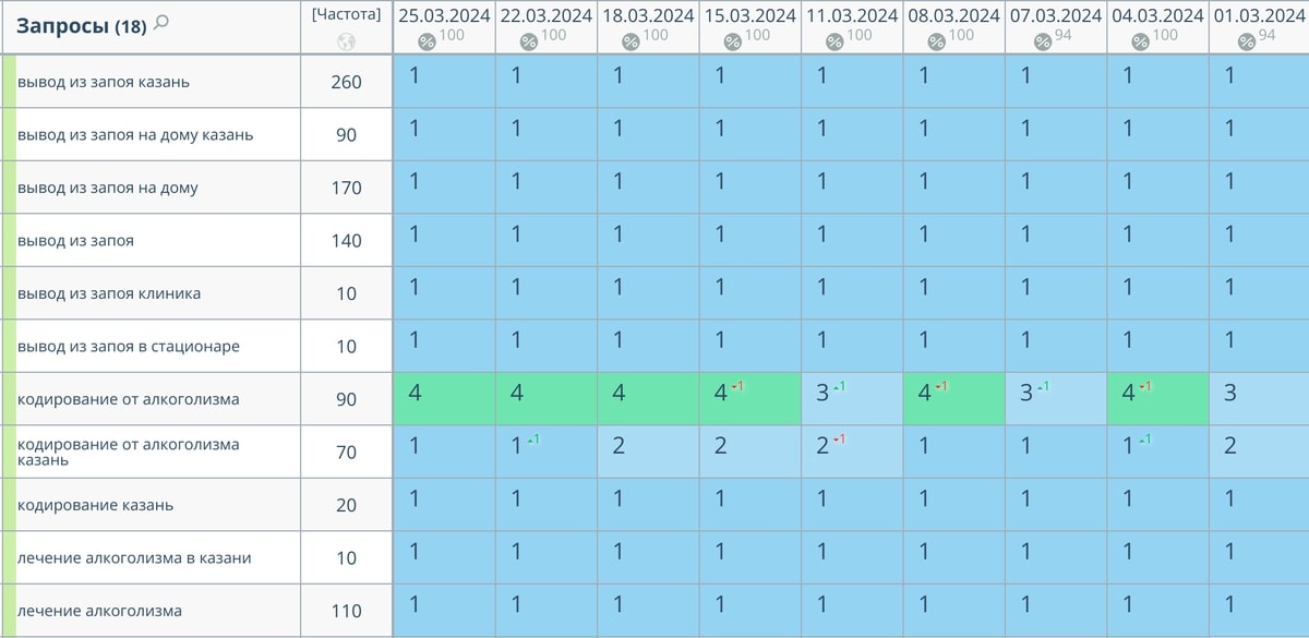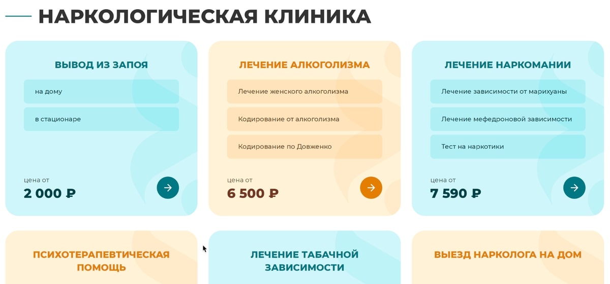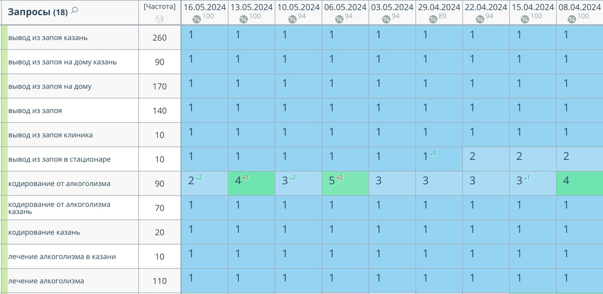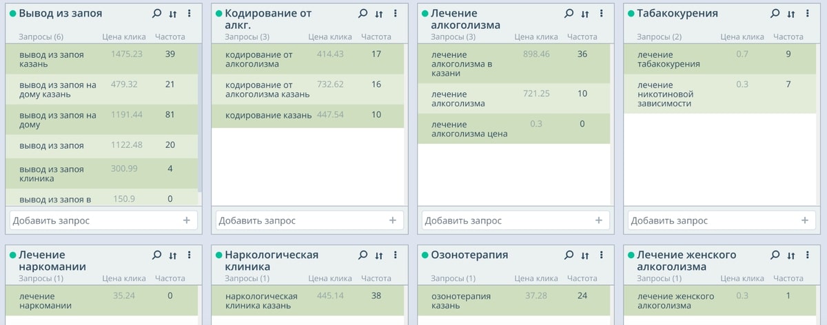 Сбор высокочастотных и среднечастотных запросов по теме услуг наркологической клиники и последующая их отбор по профильным услугам клиента.