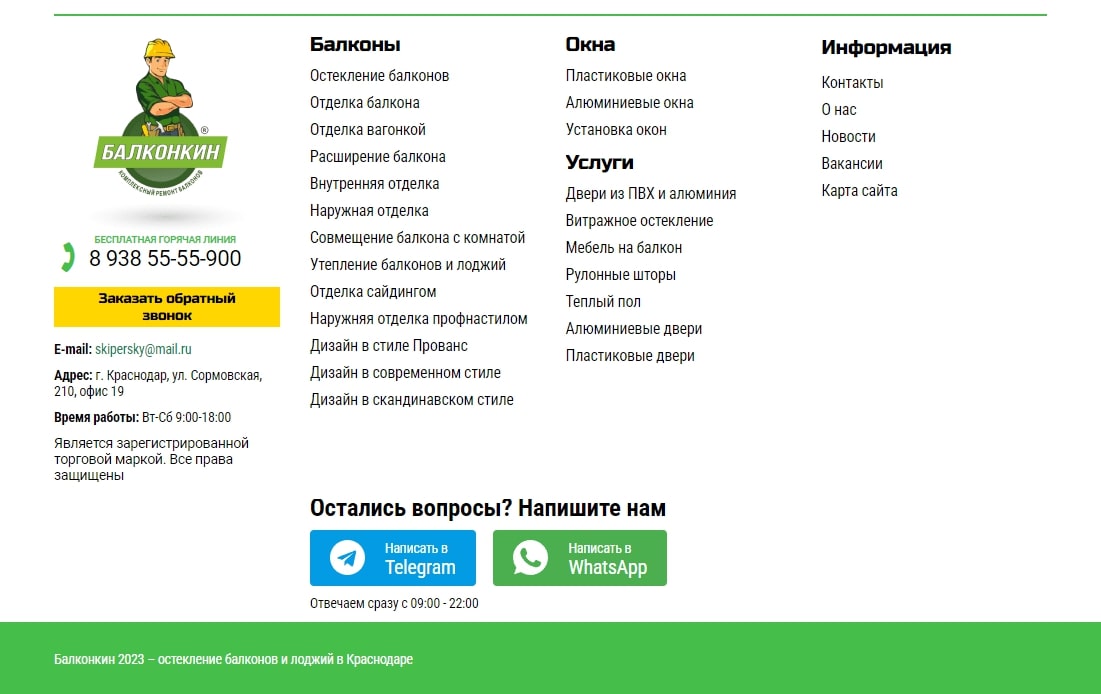 1. Вынесли в футер ссылки страниц услуг для улучшения перелинковки. Добавили ссылки на мессенджеры.