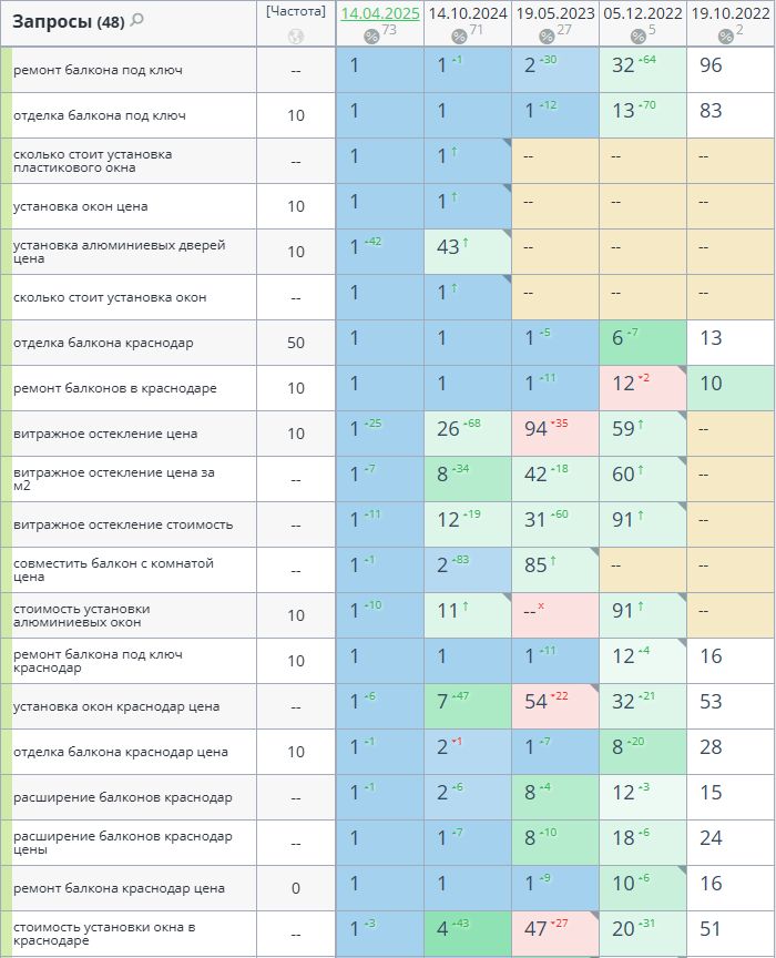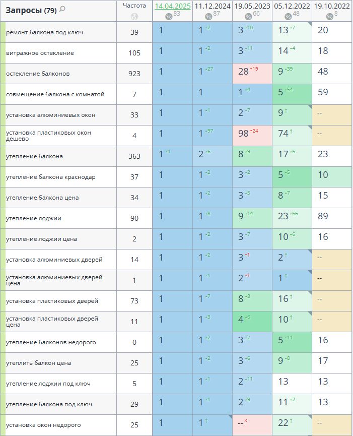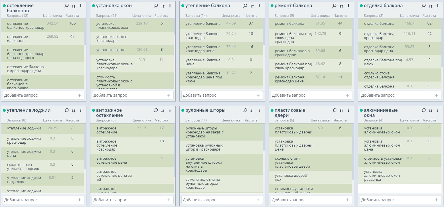 1. Сбор высокочастотных и среднечастотных запросов по теме услуг ремонта и отделки балконов, установки окон.